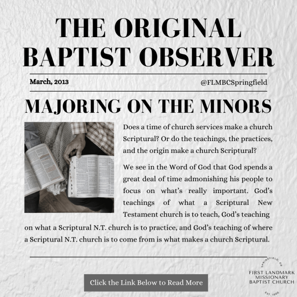 From the Original Baptist Observer, March 2013 Issue Does a time of church services make a church Scriptural? Or do the teachings, the practices, and the origin make a church Scriptural? We see in the Word of God that God spends a great deal of time admonishing his people to focus on what’s really important.... Continue Reading →