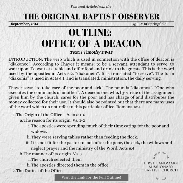 From the Original Baptist Observer, September, 2014 Issue Text: I Timothy 3:8-13 INTRODUCTION: The verb which is used in connection with the office of deacon is “diakoneo”. According to Thayer it means: to be a servant, attendant to serve, to wait upon. To wait at a table and offer food and drink to the guests.... Continue Reading →