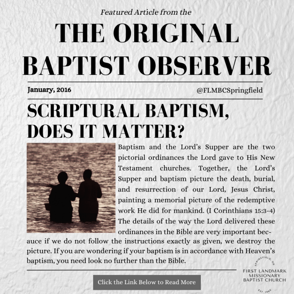 Baptism and the Lord’s Supper are the two pictorial ordinances the Lord gave to His New Testament churches. Together, the Lord’s Supper and baptism picture the death, burial, and resurrection of our Lord, Jesus Christ, painting a memorial picture of the redemptive work He did for mankind. (I Corinthians 15:3-4) The details of the way... Continue Reading →